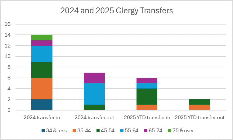 Beyond our seminaries, transfers are another source of clergy for the Orthodox Church in America. As the data below shows, for the year 2024, as well as for the current year to date, Orthodox Church in America has seen more clergy transfer in than out. Clergy transfers are thus a minor but not insignificant source of younger clergy to help meet the needs of our growing communities.